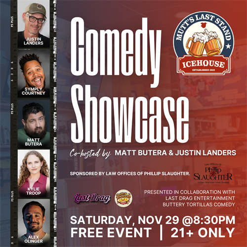 Name: Comedy Showcase at Mutt's Last StandDate: December 29, 2025Time: 8:30 PM - 9:30 PM CST